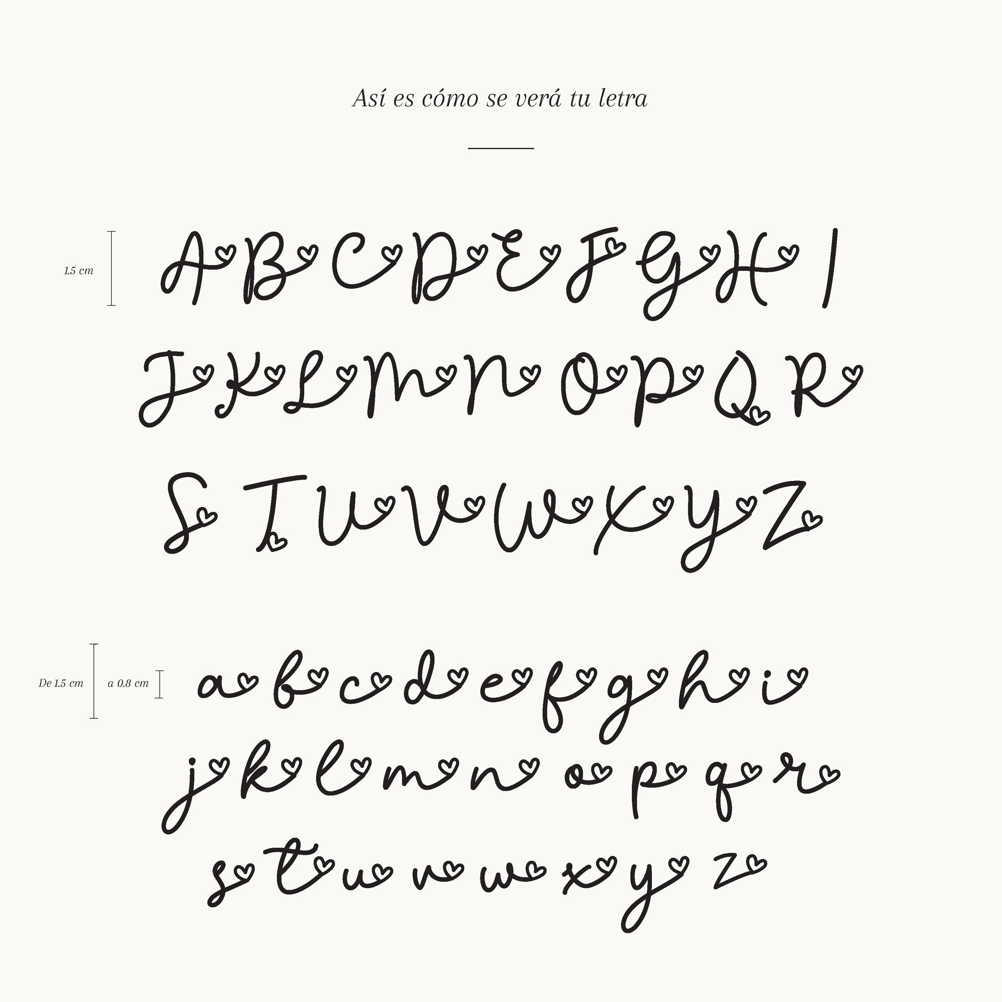 - Dimensiones: 1.5 cm de alto letra mayúscula. 0.8 cm o 1.5 cm alto letra minúscula (dependiendo la letra) *Ver última imagen*
